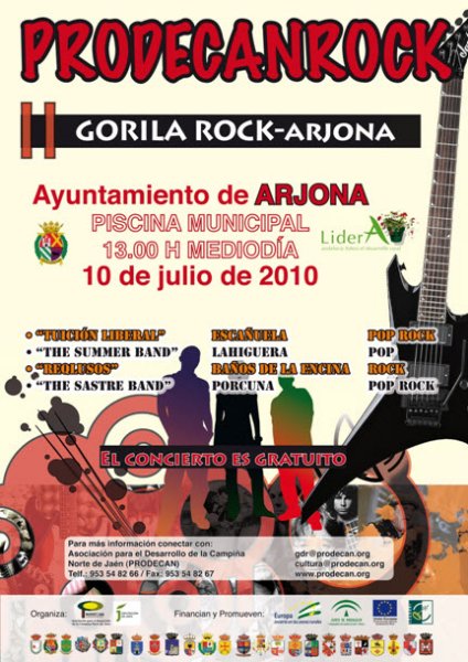 El próximo sábado día 10 de Julio tendrá lugar en Arjona una actividad cuanto menos curiosa. Se trata de la 1ª Edición del PRODECANROCK . El evento que debe su nombre a la Asociación para el Desarrollo de la Comarca de la Campiña norte de Jaén, se encuentra englobada dentro del Plan Comarcal de Cultura y Deportes, en el marco del convenio de colaboración entre PRODECAN, Diputación Provincial de Jaén y los 24 municipios menores de 20000 habitantes de la Campiña Norte de Jaén. La actividad que tendrá lugar en la Piscina Municipal coincidirá en el tiempo con la II Edición del Gorila-Rock local que organiza cada año el área de juventud del Ayuntamiento de Arjona.