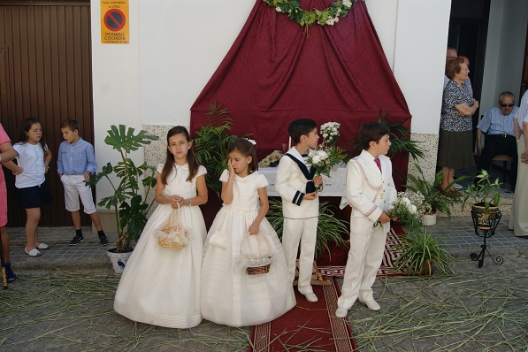 La procesión del Corpus Christi partió a las 11,35 horas de la parroquia tras la santa misa oficiada por el párroco, Luis Velasco de la Coba, y estuvo acompañada de las autoridades religiosas y civiles, una representación de cada una de las cofradías de pasión y gloria, la Banda de Tambores y Cornetas «Juan Alcalá» y más de cuarenta niños de primera comunión.