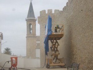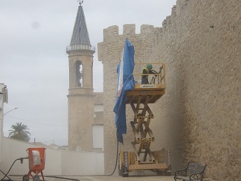 Avanzan a buen ritmo las obras de restauración del Castillo de Lopera. Tras la eliminación de la antigua nave de almacenamiento de vinos, ahora se realizan labores de limpieza de las murallas exteriores e interiores de este monumento histórico y para ello se está utilizando el sistema de chorro de arena y de agua a presión sobre las diversas partes de la muralla. También se están eliminando con un martillo compresor los añadidos de cemento y se repondrán las piedras que se han perdido.