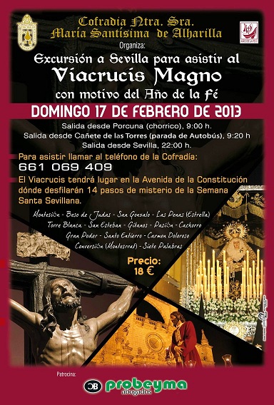 A través de un comunicado que nos ha remitido la Cofradía de la Virgen de Alharilla se informa a devotos y ciudadanos de la comarca que se va organizar una excursión a Sevilla para asistir al Viacrucis Magno. Reproducimos el cartel anunciador de este acto que es el siguiente: