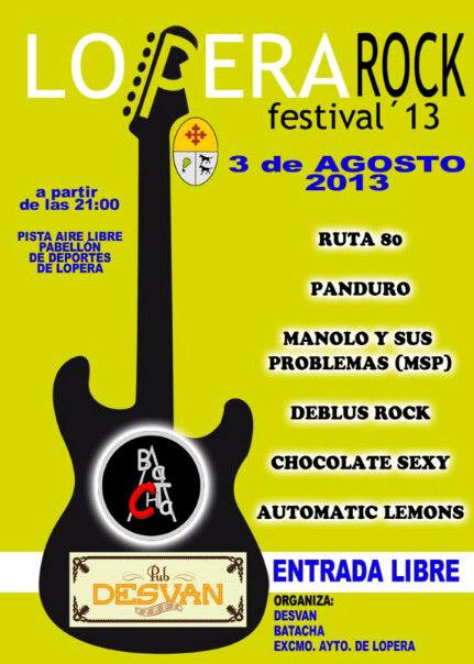 Organizado por el Pub Desván, Pub Batachá y Ayuntamiento de Lopera, hoy sábado 3 de agosto tendrá lugar en la pista al aire libre contigua al Pabellón Polideportivo de Lopera, a partir de las 9 de la noche, el Festival «Lopera Rock» con los grupos Ruta 80, Panduro, Manolo y sus problemas, Deblus Rock, Chocolate Sexy y Automatic Lemons. La entrada es libre. Están invitados todos los ciudadanos y jóvenes de la comarca.