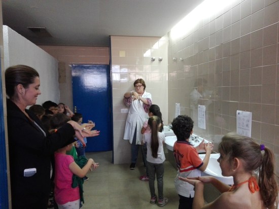 Los menores, tras realizar una visita a las dependencias de esta unidad de gestión clínica de la atención primaria de Área Sanitarria Norte de Jaén, han recibido una clase de sobre cómo frotarse los dedos y la palma con jabón, según podían ver también en unos carterles informativos colocados para ello.