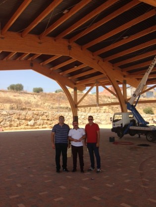 Los trabajos realizados para la creación de este nuevo espacio, que han sido financiados a través de varias anualidades del Plan Provincial de Obras y Servicios de la Diputación, han consistido previamente en la cimentación y saneamiento para colocar esta infraestructura, que se ha ejecutado con madera laminada. Esta nueva estructura, que consta de ocho pilares, está apoyada en cuatro grandes pórticos y cada faldón de cubierta tiene una pendiente y una altura diferentes.