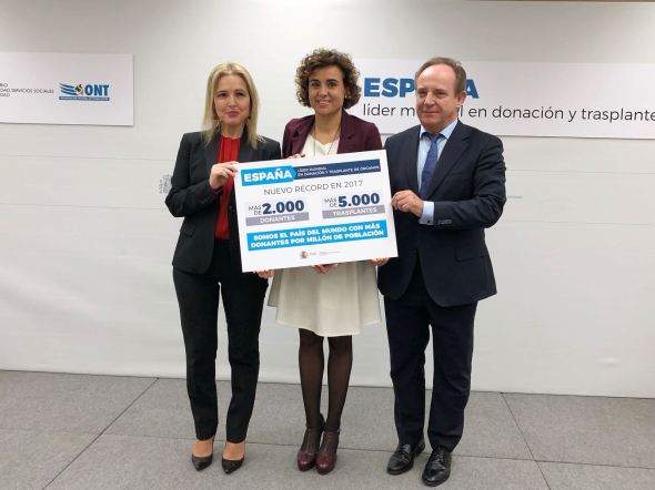 La ministra de Sanidad, Servicios Sociales e Igualdad, Dolors Montserrat, ha anunciado hoy que “España se mantiene como líder mundial en donación y trasplantes gracias a la generosidad de los donantes y a sus familias a los profesionales, a la ONT, a nuestro gran Sistema Nacional de Salud y al compromiso firme y decidido de este gobierno por dar vida a quien más lo necesita”. Así, nuestro país mantiene el liderazgo mundial durante 26 años consecutivos, pues ha vuelto a batir su propio récord al alcanzar en 2017 los 46,9 donantes por millón de población, con un total de 2.183 donantes.