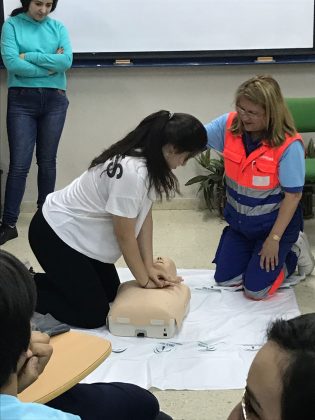 Enfermeras de esta unidad de gestión clínica del Área Sanitaria Norte de Jaén han enseñado a los alumnos y profesores de este instituto de enseñanza cómo actuar ante una parada cardiorrespiratoria, para lo que se han simulado situaciones de emergencia de este tipo con maniquíes.