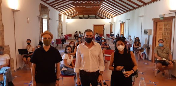 Pablo Berger, Ángel Vera y Puy Oria, en el taller de Rodando por Jaén. Foto: Diputación de Jaén.El diputado de Cultura y Deportes, Ángel Vera, ha visitado esta mañana el taller en el que se está preparando la grabación de los cortos finalistas del concurso Rodando por Jaén que organiza la Diputación. A lo largo del viernes y del fin de semana, los equipos de los ocho proyectos seleccionados están ultimando en el Antiguo Hospital de San Juan de Dios la producción de estos trabajos con el asesoramiento de los directores Pablo Berger y Montxo Armendáriz, y la productora Puy Oria.