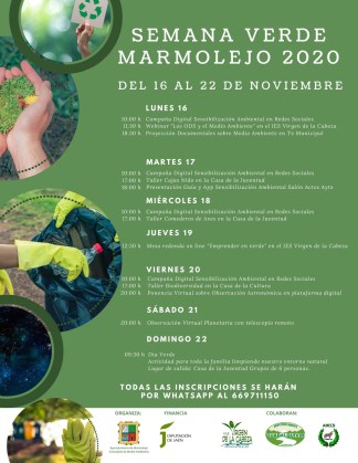 Del 16 al 22 de noviembre Marmolejo vivirá su ya tradicional Semana Verde con una programación pensada para toda la población y adaptada a la actual situación sanitaria para poder disfrutarla desde casa. Actividades de divulgación, formación, sensibilización y sostenibilidad ecológica forman parte de la programación preparada para estos siete intensos días cuyo objetivo es recordar la importancia de cuidar nuestro entorno y de participar en él para mejorarlo y contribuir a su sostenibilidad.