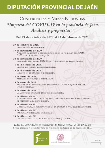 El Instituto de Estudios Giennenses (IEG) de la Diputación Provincial de Jaén ha organizado un ciclo compuesto por doce conferencias y mesas redondas en las que expertos de distintos ámbitos –desde la sanidad, hasta la economía, la cultura, la educación, el turismo o los sectores de proximidad, entre muchos otros– analizarán el impacto de la pandemia del COVID-19 en la provincia de Jaén. Cada una de las actividades de este ciclo, que se desarrollará hasta el próximo mes de febrero, se retransmitirá de forma online, a partir de las 19.00 horas, a través de la web de este organismo autónomo: http://www.dipujaen.es/IEG.