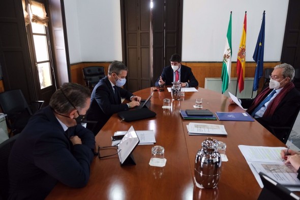 El vicepresidente y consejero de Turismo, Regeneración, Justicia y Administración Local, Juan Marín, acompañado del consejero de Hacienda y Financiación Europea, Juan Bravo, y el de Transformación Económica, Industria, Conocimiento y Universidades, Rogelio Velasco, han mantenido un encuentro con el alcalde de Linares, Raúl Caro, para informar de las iniciativas en las que trabaja el Gobierno andaluz para la reactivación económica del municipio.
