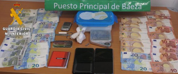 Alertada una patrulla de Seguridad Ciudadana de la Guardia Civil, con posterioridad interceptaron el vehículo circulando por la localidad de Baeza, el cual era ocupado por un hombre y una mujer, portando ésta una fiambrera de plástico, conteniendo en su interior dos envoltorios, uno de ellos con 5’80 gramos de cocaína y otro con 1’72 gramos de heroína, así como dos balanzas de precisión, unas tijeras pequeñas, recortes circulares de plástico del mismo tamaño que los envoltorios de las sustancias estupefacientes, una tiza de yeso blanco, una cuchilla, una tarjeta de plástico con restos de sustancia en polvo. Todo ello instrumentos y objetos para el “corte” y trafico de estupefacientes al menudeo. Además se le intervinieron dos terminales de telefonía móvil, 750 euros en metálico y documentación que está siendo analizada.