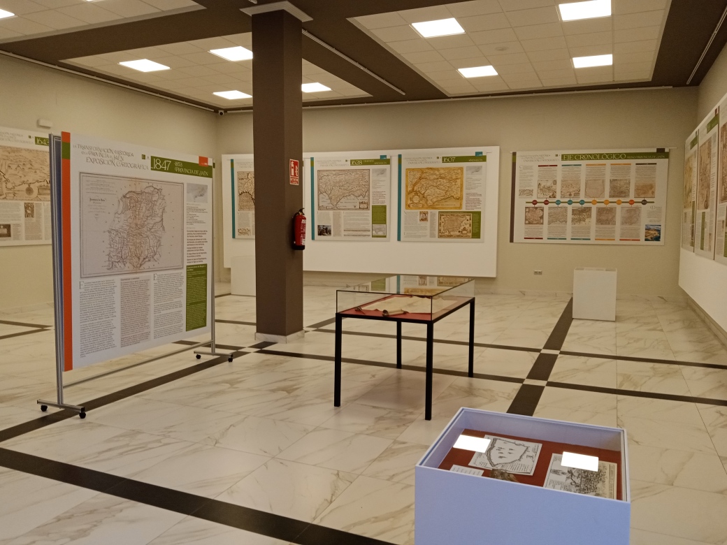 Los paneles están acompañados en distintas vitrinas con material cartográfico original, monografías y diccionarios geográficos de la colección de fondos del Instituto de Estudios Giennenses, así como objetos propios de la cartografía histórica.