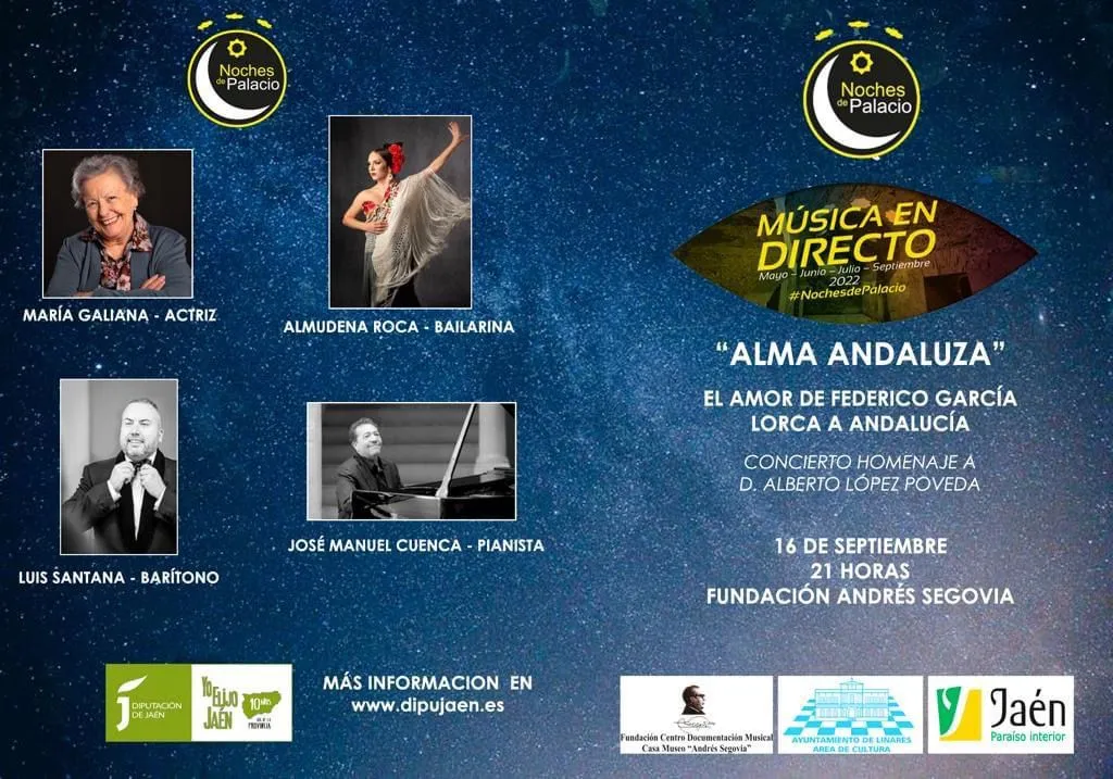 Las Noches de Palacio que organiza la Diputación llegan este viernes, 16 de septiembre, a Linares con el espectáculo “Alma andaluza. El amor de Federico García Lorca a Andalucía”. La Fundación Andrés Segovia acogerá a partir de las 21 horas este recital lírico para el que el acceso será libre hasta completar el aforo. El barítono Luis Santana, el pianista José Manuel Cuenca, la bailarina Almudena Roca y la actriz María Galiana, actúan en este evento enmarcado en el 90º aniversario de la Fundación de la Barraca, compañía de teatro fundada por el poeta granadino.