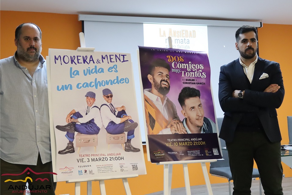 A lo largo de la presentación de las actuaciones de marzo, el edil ha estado acompañado por el representante de la empresa promotora Telonea, Juan Alcaraz. Por un lado, los gaditanos Manolo Morera y Carlos Mení ofrecerán el próximo 3 de marzo un show humorístico sobre situaciones cotidianas de la vida.