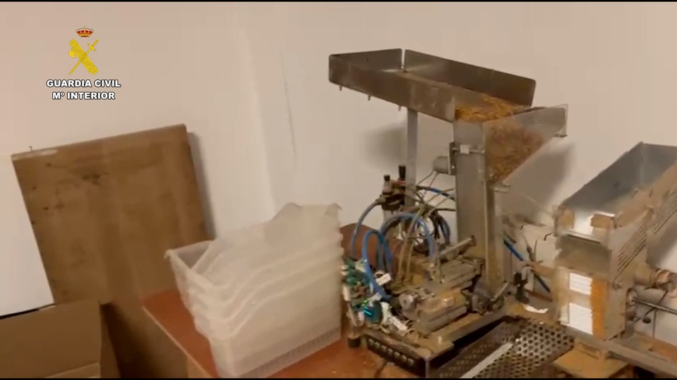 Durante la segunda fase, los agentes interceptaron el vehículo del investigado y procedieron a su registro, localizando en su interior cigarrillos preparados para la venta y blíster de tabaco picado. Posteriormente, se llevó a cabo un registro en la vivienda utilizada como taller clandestino, donde se intervinieron, 70 kg de tabaco dispuesto para su venta, 420 paquetes de tabaco picado, 115.000 cigarrillos con filtros para rellenar, 15.000 bolsas para empaquetado, 1.500 cajetillas de tabaco impresas, imitando una marca comercial, más de una decena de máquinas industriales de trituración, elaboración y empaquetado, así como 11,415 euros en efectivo.
